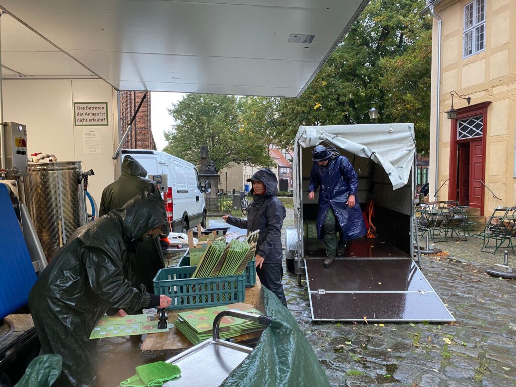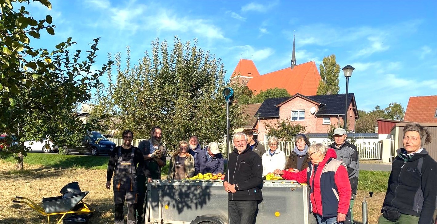 Im Arbeitsplan des Arbeitskreises Werbener Altstadt e.V. stand der Apfeltag 2025 an. Konnten am Erntetag die vollhängenden Bäume noch bei strahlenden Sonnenschein abgeerntet werden, musste das Mosten dann bei strömenden Regen durchgezogen werden. Die Verkaufsbuden und der Trödelverkaufsstand konnten leider nicht aufgebaut werden. Mit Humor, Einsatz und zweimal umziehen wurde aber auch dieser Tag gemeistert. Spätestens beim gemeinsamen Grog im „Lämpel“ war die Anstrengung fasst vergessen. Nun steht wieder genug gesunder Apfelsaft für Punsch zum Christmarkt bereit.