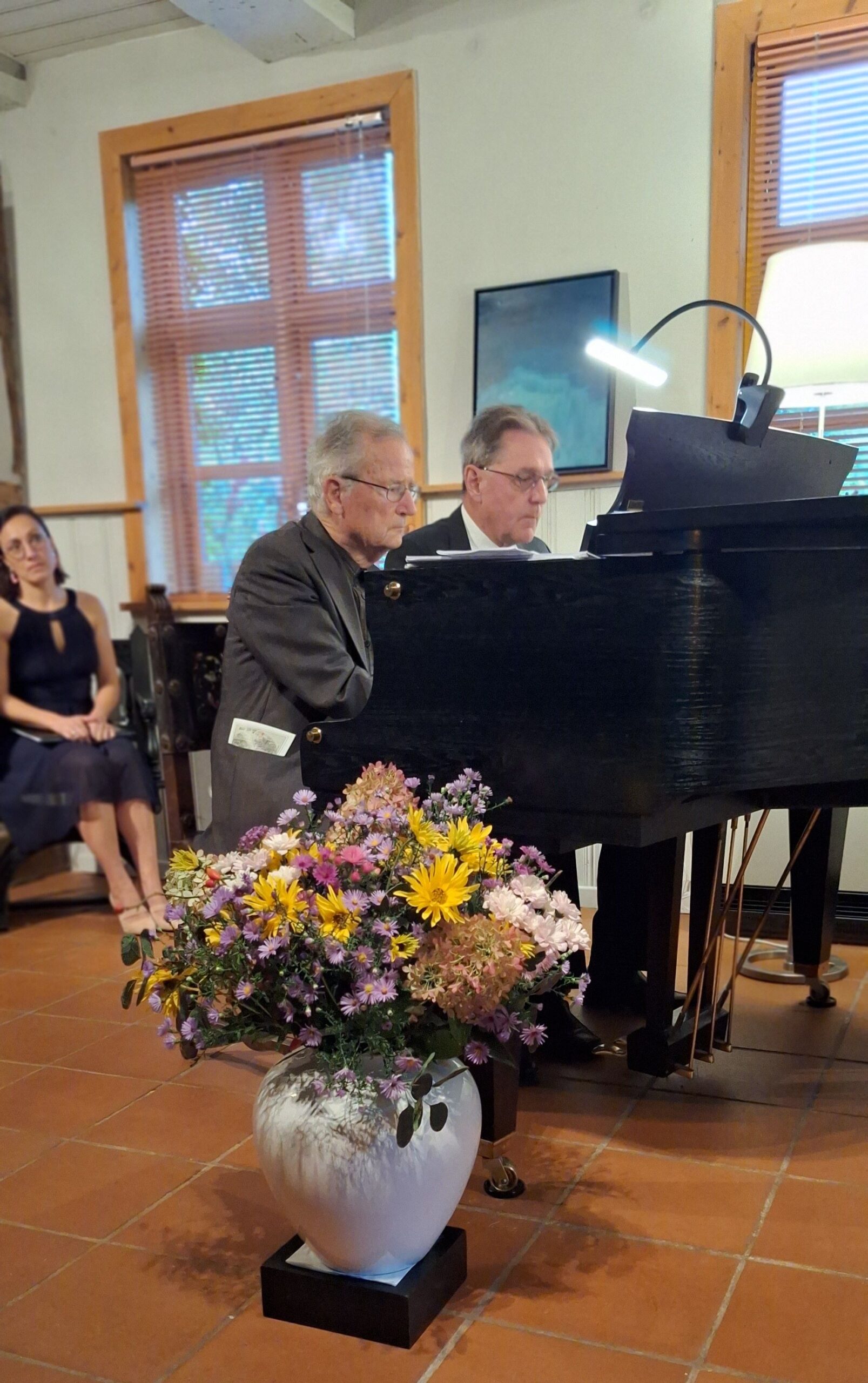 Im konzertanten Teil der Veranstaltung spielten Christian Kluttig und Jochen Großmann vierhändig 4 Fugen aus der Fugensammlung „Die Kunst der Fuge“ von Johann Sebastian Bach. Christian Kluttig erläuterte kompositorische Besonderheiten von Fugen als mehrstimmige Kompositionen, bei denen die Stimmen, ähnlich wie bei einem Kanon, nacheinander einsetzen. Das Eingangsthema wird dabei vielfältig variiert, sowohl hinsichtlich der Tonabstände als auch rhythmisch.