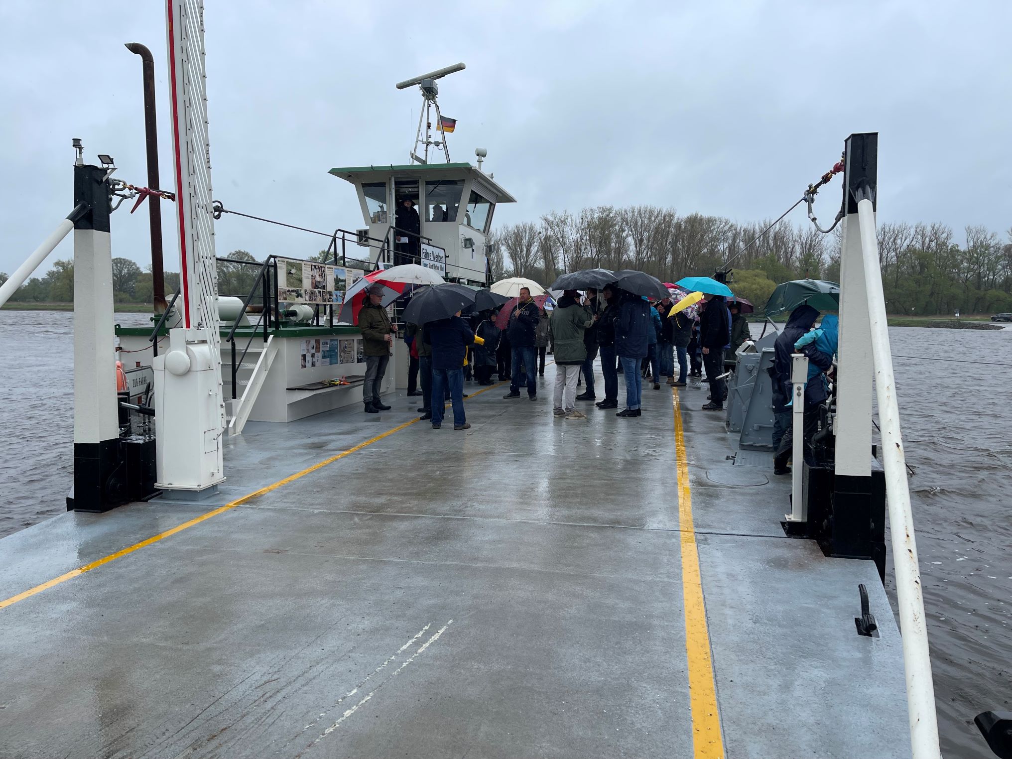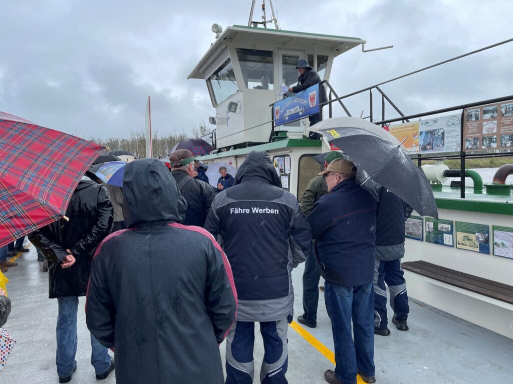 Trotz strömenden Regen kamen Interessierte um der Eröffnung der Feierlichkeiten zur 1. Veranstaltung „800 Jahre Fährrecht“ beizuwohnen. Bei einer Überfahrt mit der Fähre ging Bürgermeister Bernd Schulze bei seiner Rede auf die heutigen Probleme mit dem Betrieb einer Fähre ein und gab auch einen kurzen Abriss zur Geschichte der Fährgerechtigkeit.